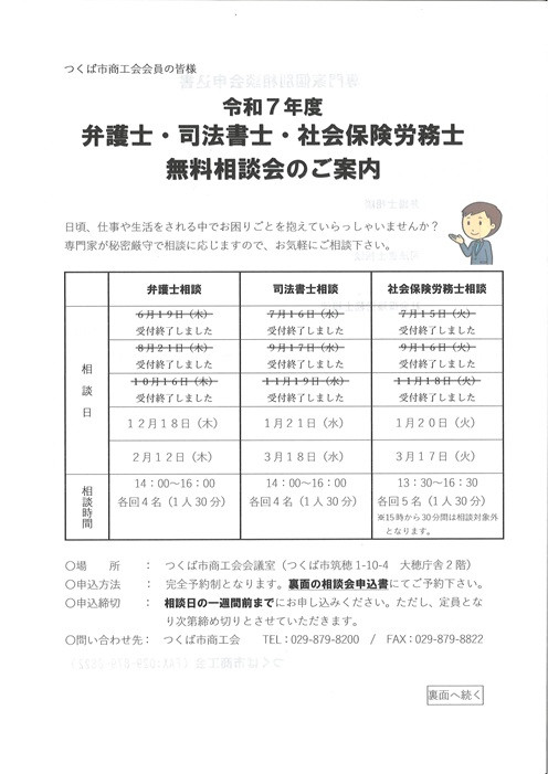つくば市商工会の会員向けに、司法書士による無料相談会が開催されます。